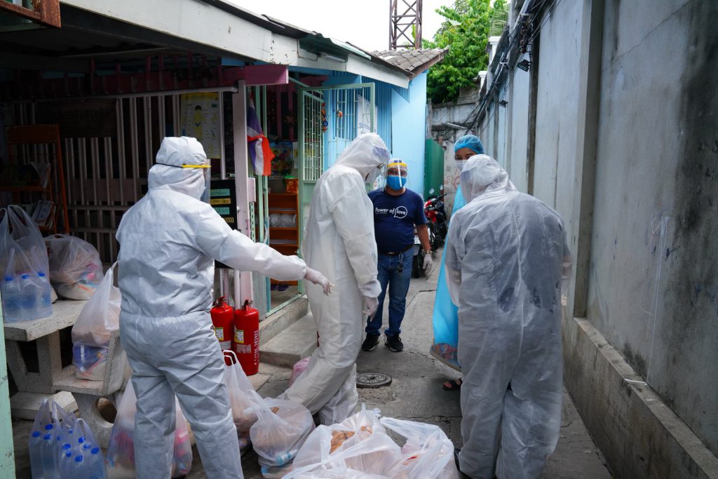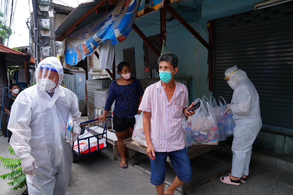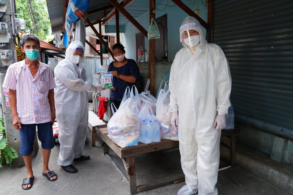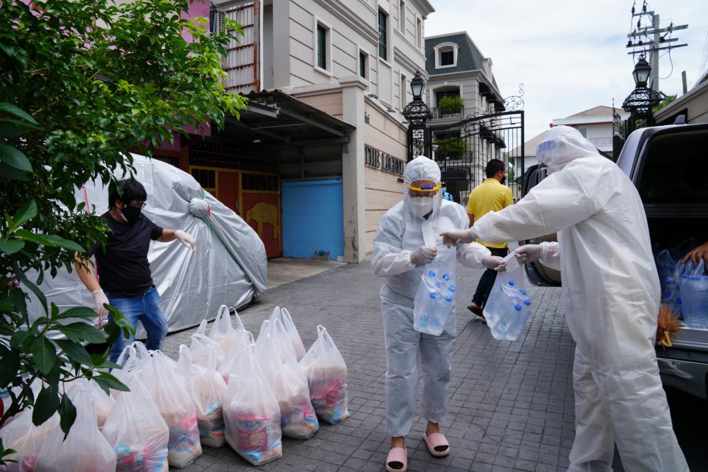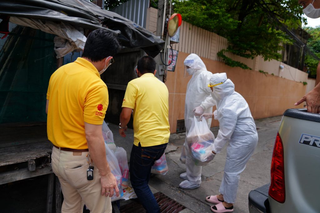 16 สิงหาคม 2021 เวลา 13.00 น. มงซินญอร์ วิษณุ ธัญญอนันต์ รองเลขาธิการสภาประมุขบาทหลวงโรมันคาทอลิกแห่งประเทศไทย และ คุณพ่อไพรัช ศรีประเสริฐ ผู้ช่วยเลขาธิการสภาฯ ฝ่ายสังคม (คาริตัสไทยแลนด์) นำทีมงานเจ้าหน้าที่จากคาริตัสไทยแลนด์ และสื่อมวลชนคาทอลิกประเทศไทย สวมชุด PPE ลงพื้นที่สีแดงเข้มบริเวณชุมชนซอยนนทรี – เขตยานนาวา และชุมชนพื้นที่ใกล้เคียงอาคารสภาประมุขบาทหลวงโรมันคาทอลิกฯ เพื่อมอบถุงยังชีพให้กับผู้ประสบภัยโควิด-19