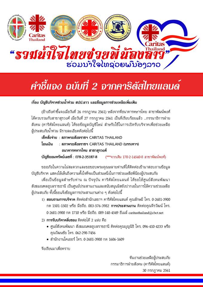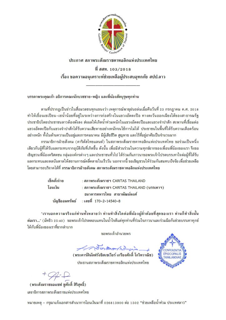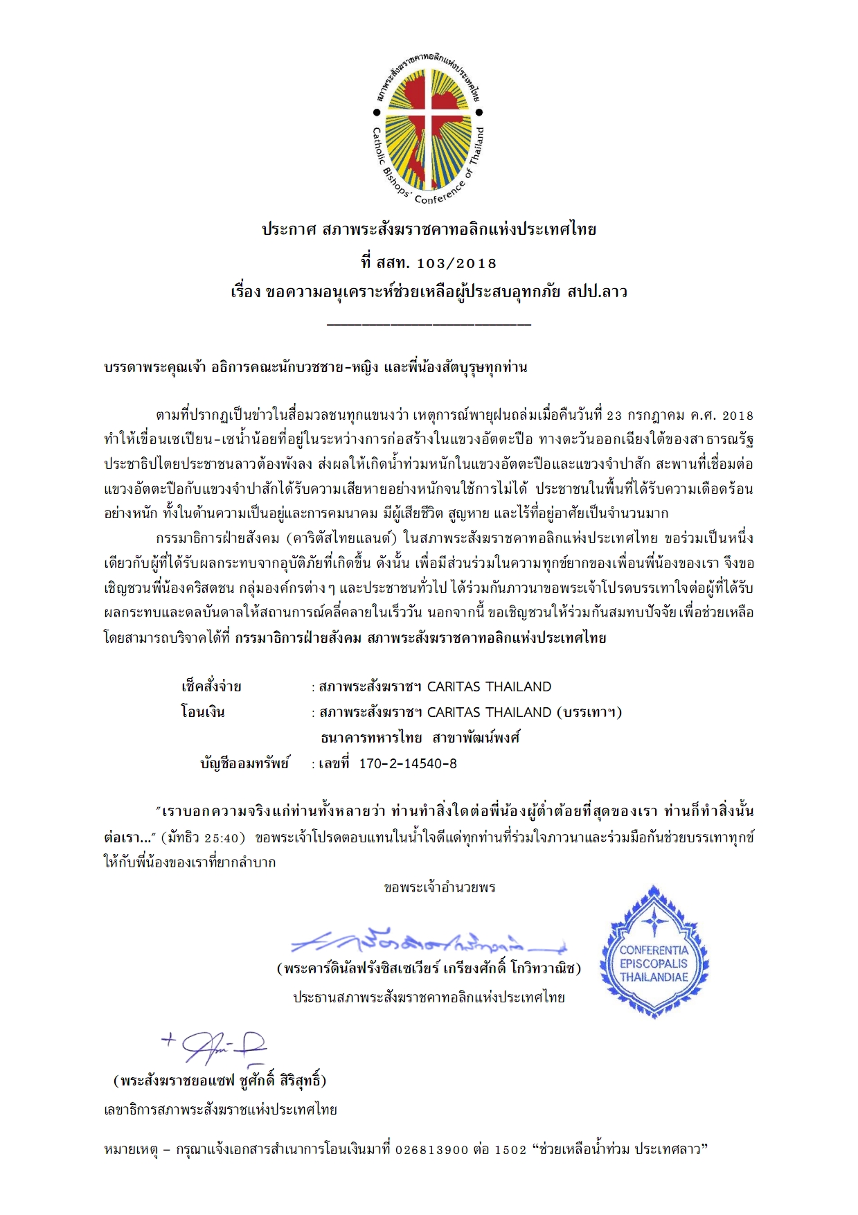 ชี้แจงเรื่องการเปลี่ยนบัญชีบริจาคช่วยน้ำท่วม สปป.ลาว ตามประกาศฯ เลขที่ สสท. 103/2018