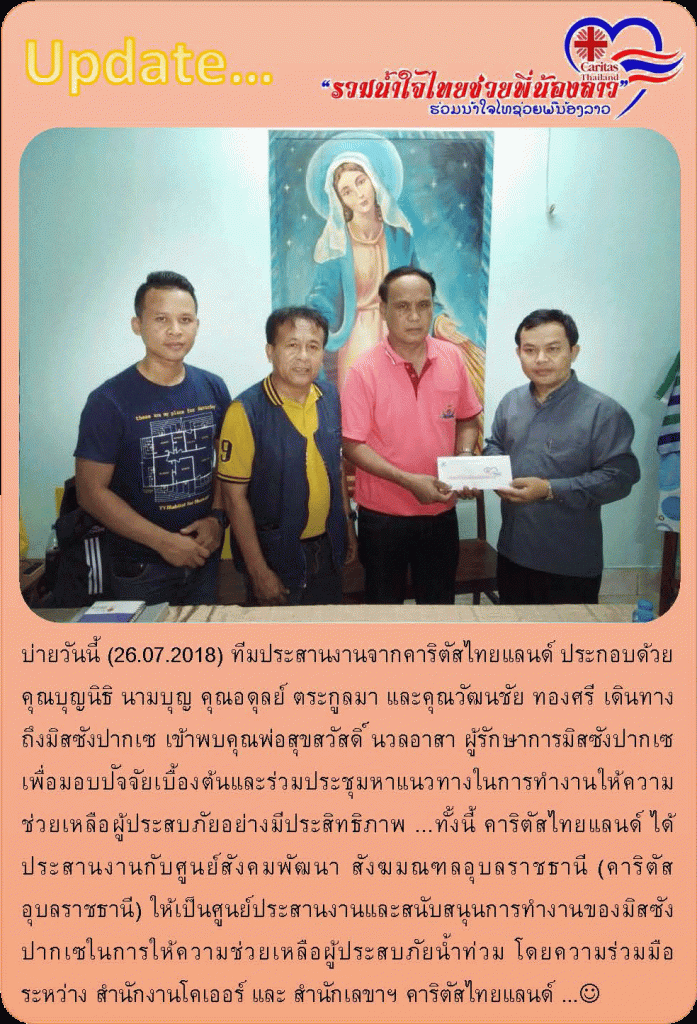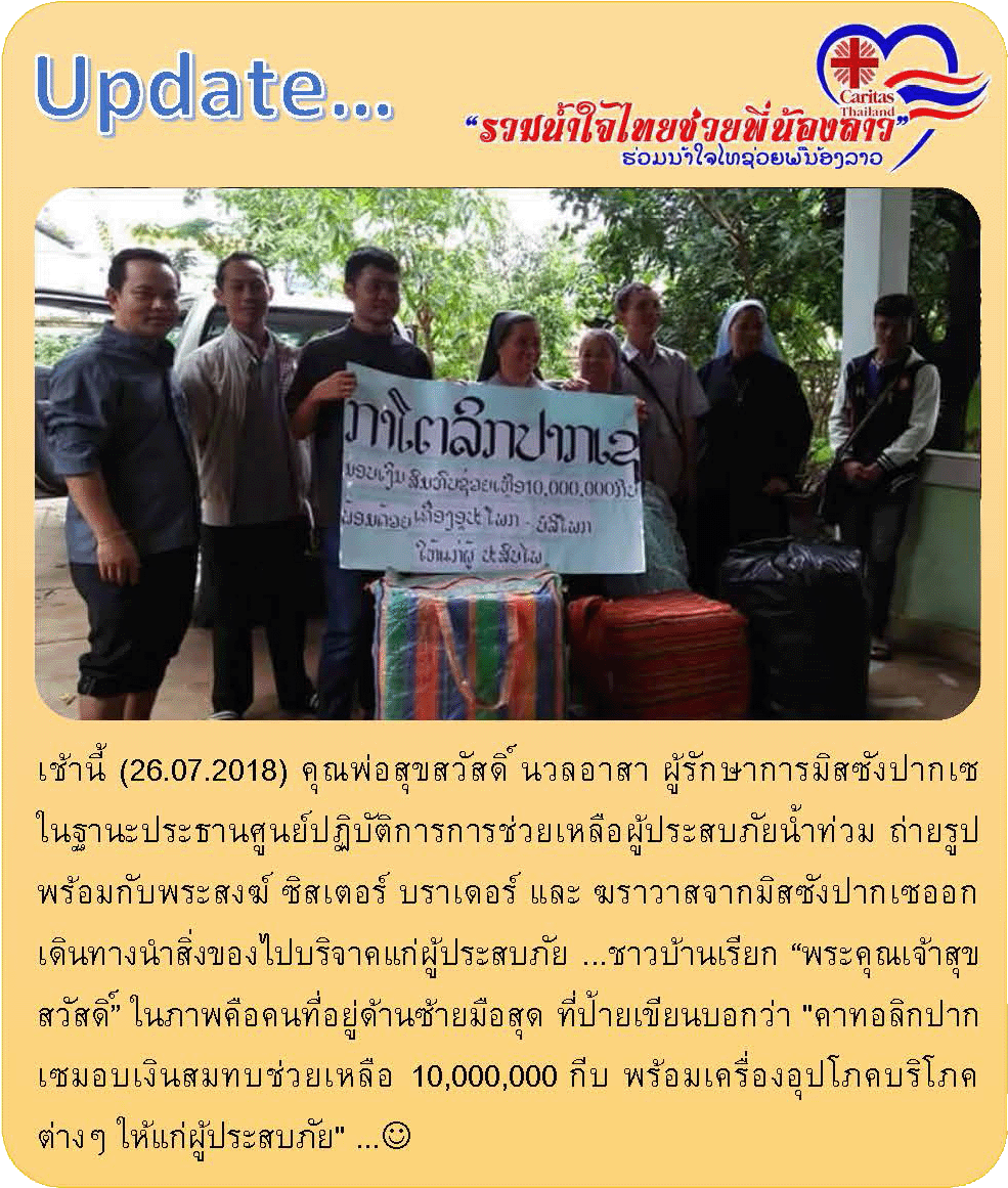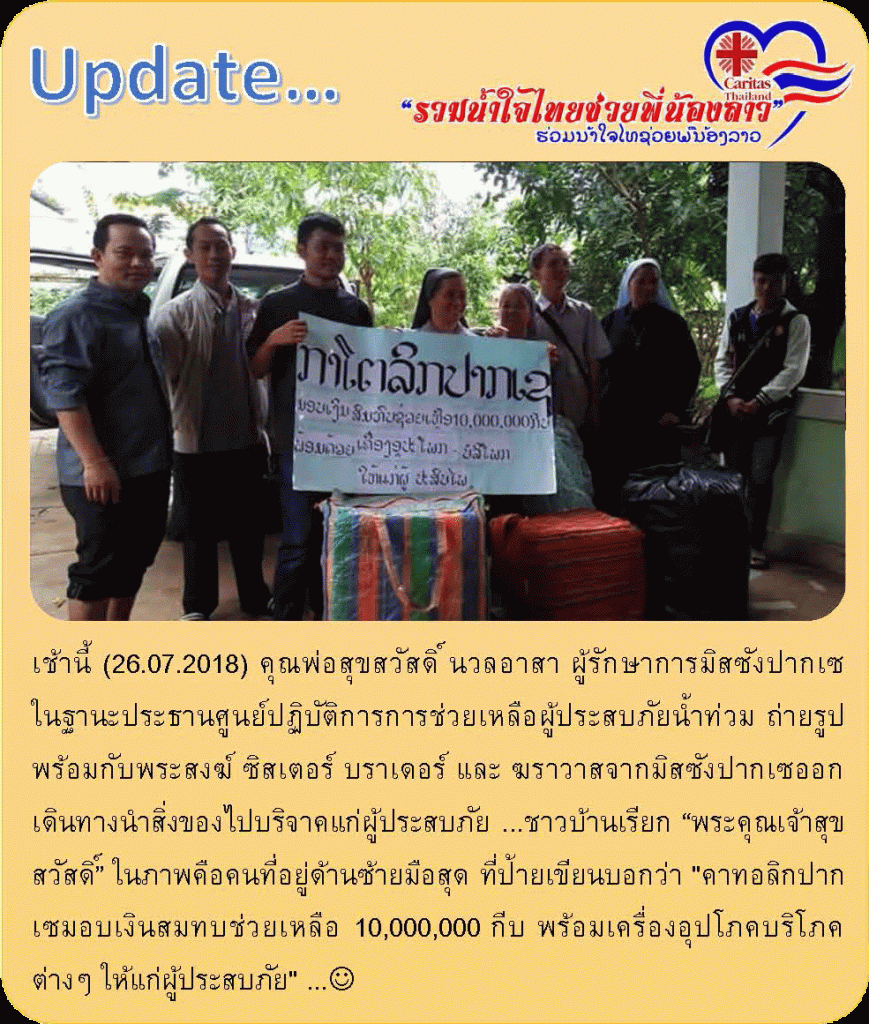 อย่างไรก็ดีในเวลานี้ทางหน่วยงานก็ได้ทำงานให้ความช่วยเหลือผู้ประสบภัยอย่างเร่งด่วนแล้ว สามารถติดตามข่าวการความช่วยเหลือได้ที่เฟชบุ๊ค https://www.facebook.com/THAIcatholics.Floods/