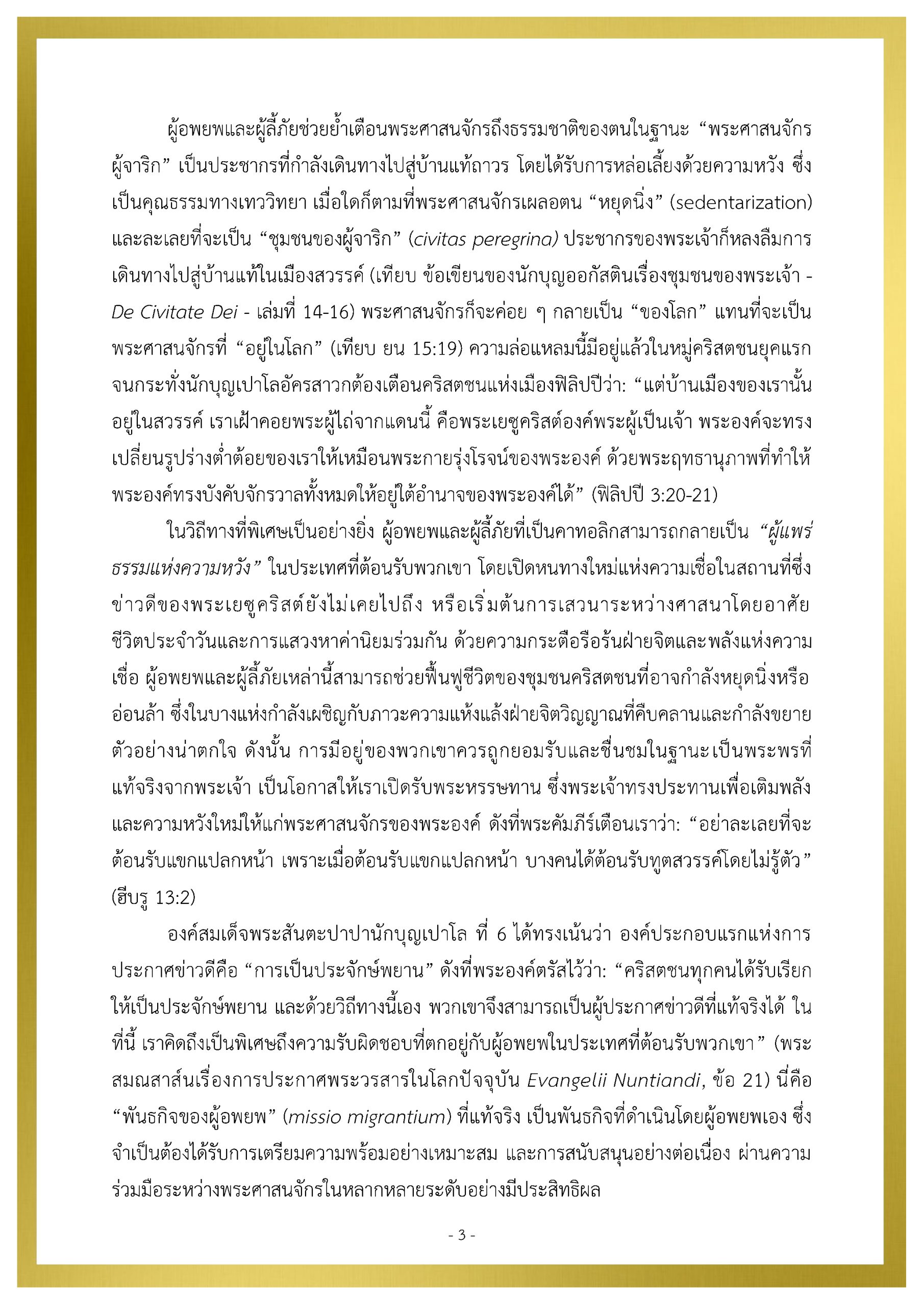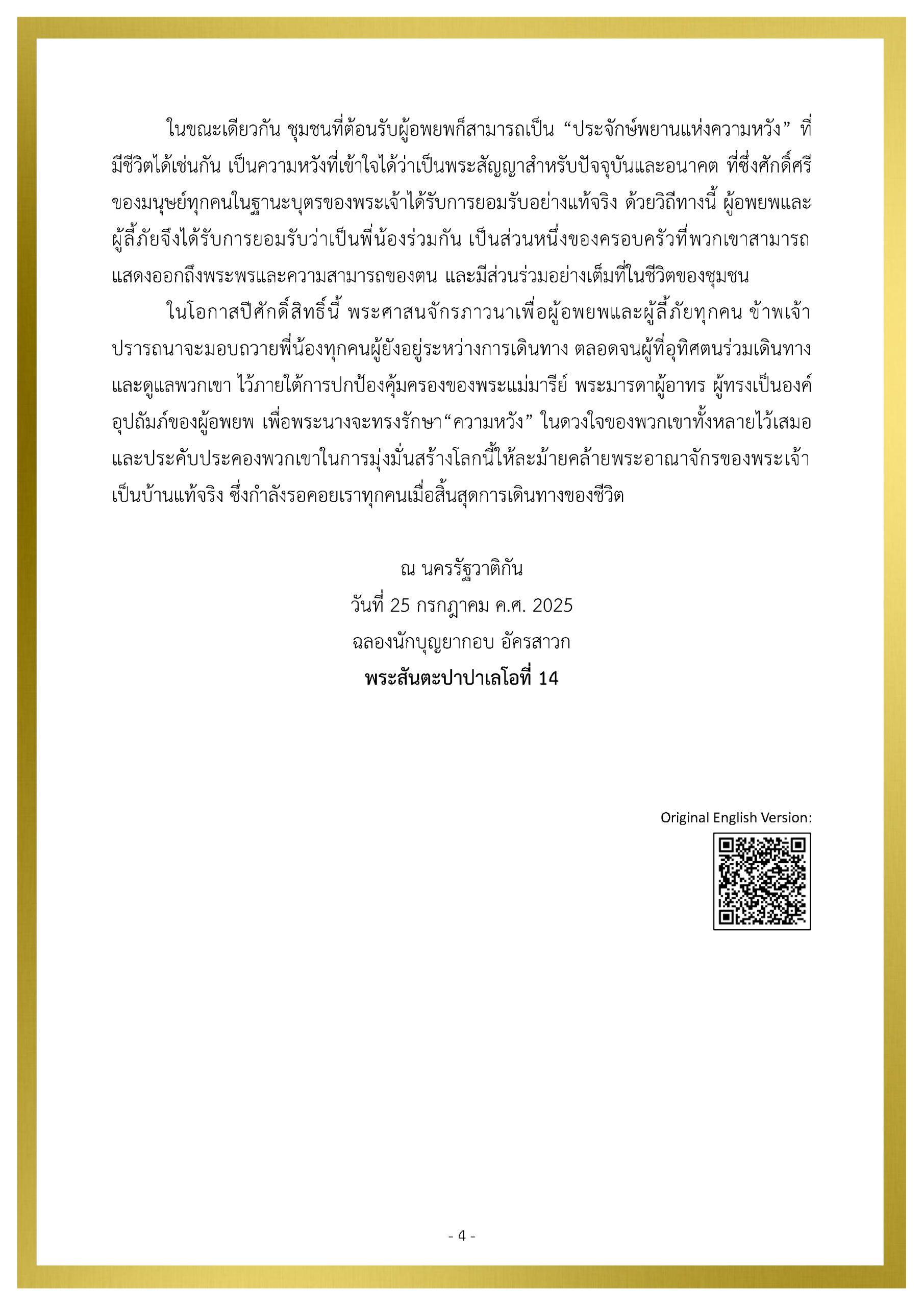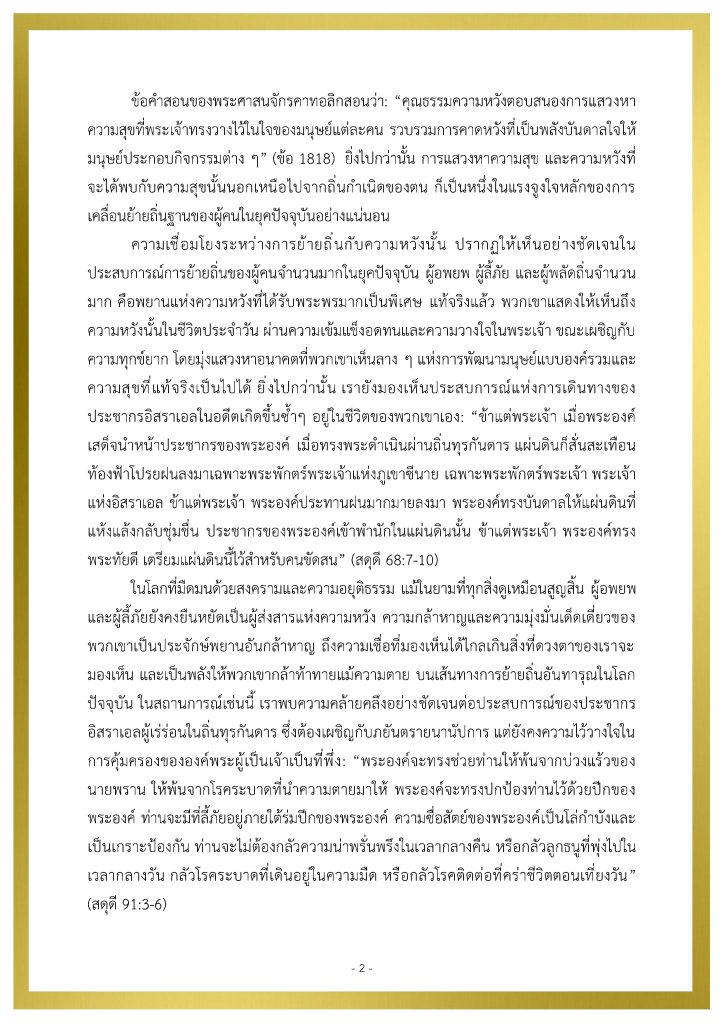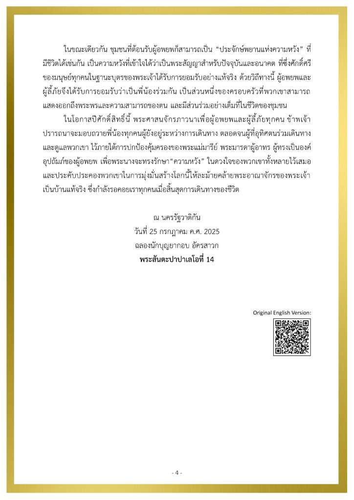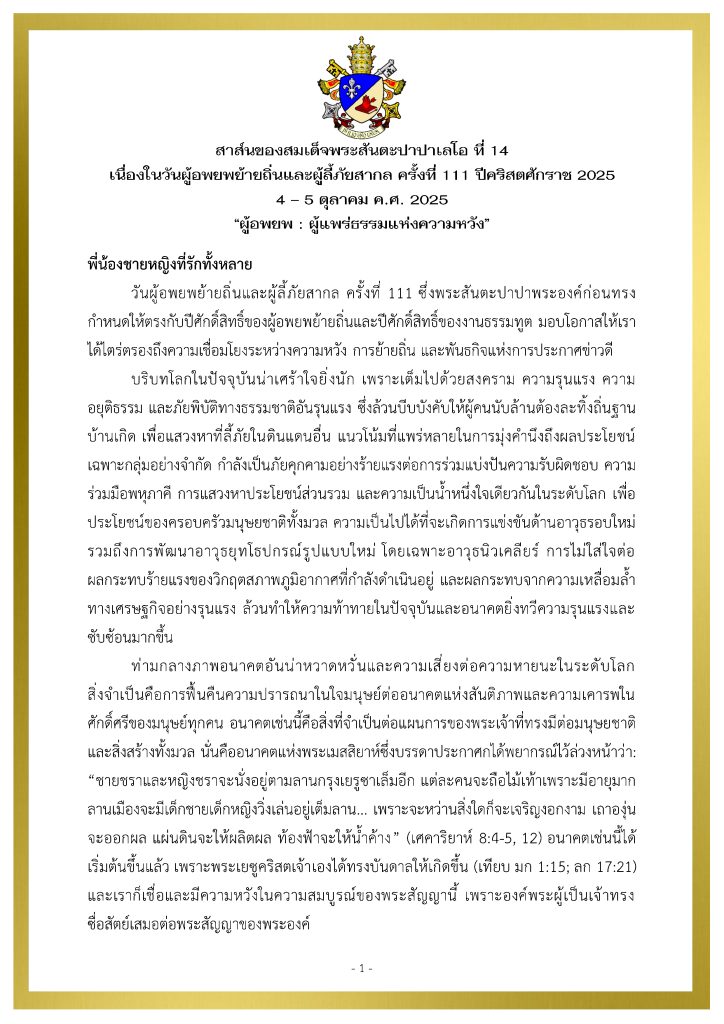 สาส์นของสมเด็จพระสันตะปาปาเลโอ ที่ 14 เนื่องในวันผู้อพยพย้ายถิ่นและผู้ลี้ภัยสากล ครั้งที่ 111 ปีคริสตศักราช 2025 People on the Move ข่าวประชาสัมพันธ์ 19 Sep 2025 270 share tweet share PDF Download