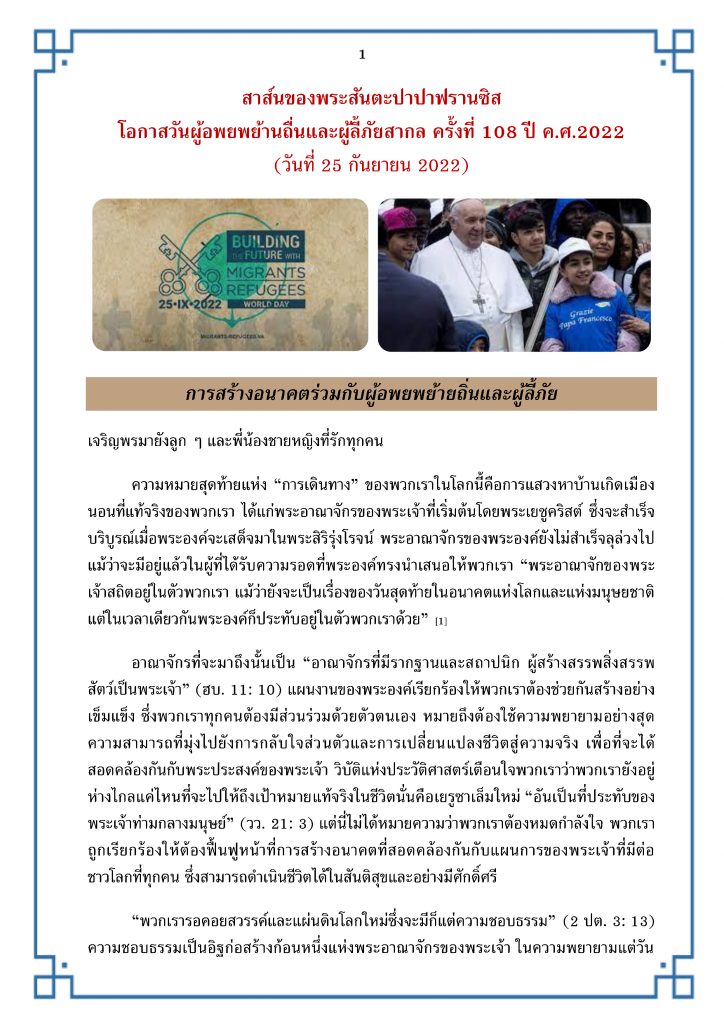 ลูก ๆ และพี่น้องชายหญิงที่รัก นี่จะเป็นโอกาสพิเศษสำหรับบรรดาเยาวชน หากพวกเราปรารถนาที่จะร่วมมือกับพระบิดาเจ้าในการสร้างอนาคต ขอให้พวกเรากระทำดังกล่าวพร้อมกันกับบรรดาพี่น้องชายหญิงของพวกเราซึ่งเป็นผู้อพยพย้ายถิ่นฐาน ขอให้พวกเราช่วยกันสร้างอนาคตตั้งแต่วันนี้ เพราะอนาคตเริ่มต้นด้วยวันนี้ ซึ่งเริ่มต้นพร้อมกับพวกเราแต่ละคน พวกเราไม่สามารถปล่อยอนาคตไว้ให้เป็นเรื่องของชนรุ่นหลัง ซึ่งภาระความรับผิดชอบในการตัดสินใจที่จำเป็นต้องกระทำ ณ บัดนี้ เพื่อที่จะทำให้แผนการของพระเจ้าได้สำเร็จบริบูรณ์ไปและพระอาณาจักรแห่งความยุติธรรม ภราดรภาพ และสันติสุขของพระองค์จะได้มาถึง