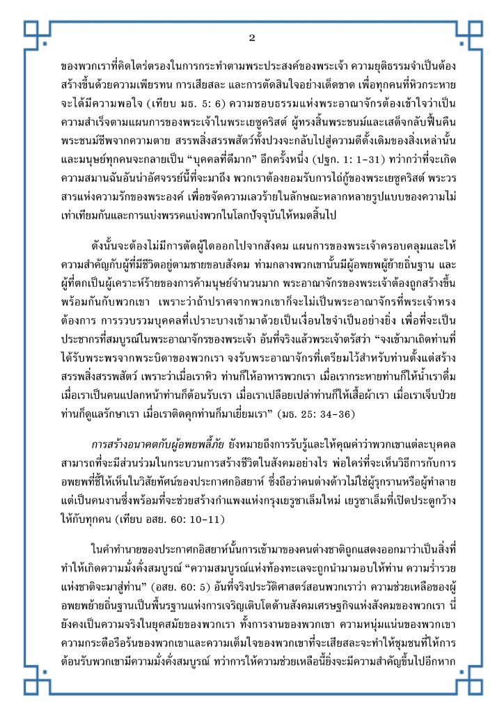ดังนั้นจะต้องไม่มีการตัดผู้ใดออกไปจากสังคม แผนการของพระเจ้าครอบคลุมและให้ความสำคัญกับผู้ที่มีชีวิตอยู่ตามชายขอบสังคม ท่ามกลางพวกเขานั้นมีผู้อพยพผู้ย้ายถิ่นฐาน และผู้ที่ตกเป็นผู้เคราะห์ร้ายของการค้ามนุษย์จำนวนมาก พระอาณาจักรของพระเจ้าต้องถูกสร้างขึ้นพร้อมกันกับพวกเขา เพราะว่าถ้าปราศจากพวกเขาก็จะไม่เป็นพระอาณาจักรที่พระเจ้าทรงต้องการ การรวบรวมบุคคลที่เปราะบางเข้ามาด้วยเป็นเงื่อนไขจำเป็นอย่างยิ่ง เพื่อที่จะเป็นประชากรที่สมบูรณ์ในพระอาณาจักรของพระเจ้า อันที่จริงแล้วพระเจ้าตรัสว่า “จงเข้ามาเถิดท่านที่ได้รับพระพรจากพระบิดาของพวกเรา จงรับพระอาณาจักรที่เตรียมไว้สำหรับท่านตั้งแต่สร้างสรรพสิ่งสรรพสัตว์ เพราะว่าเมื่อเราหิว ท่านก็ให้อาหารพวกเรา เมื่อเรากระหายท่านก็ให้น้ำเราดื่ม เมื่อเราเป็นคนแปลกหน้าท่านก็ต้อนรับเรา เมื่อเราเปลือยเปล่าท่านก็ให้เสื้อผ้าเรา เมื่อเราเจ็บป่วยท่านก็ดูแลรักษาเรา เมื่อเราติดคุกท่านก็มาเยี่ยมเรา” (มธ. 25: 34-36)