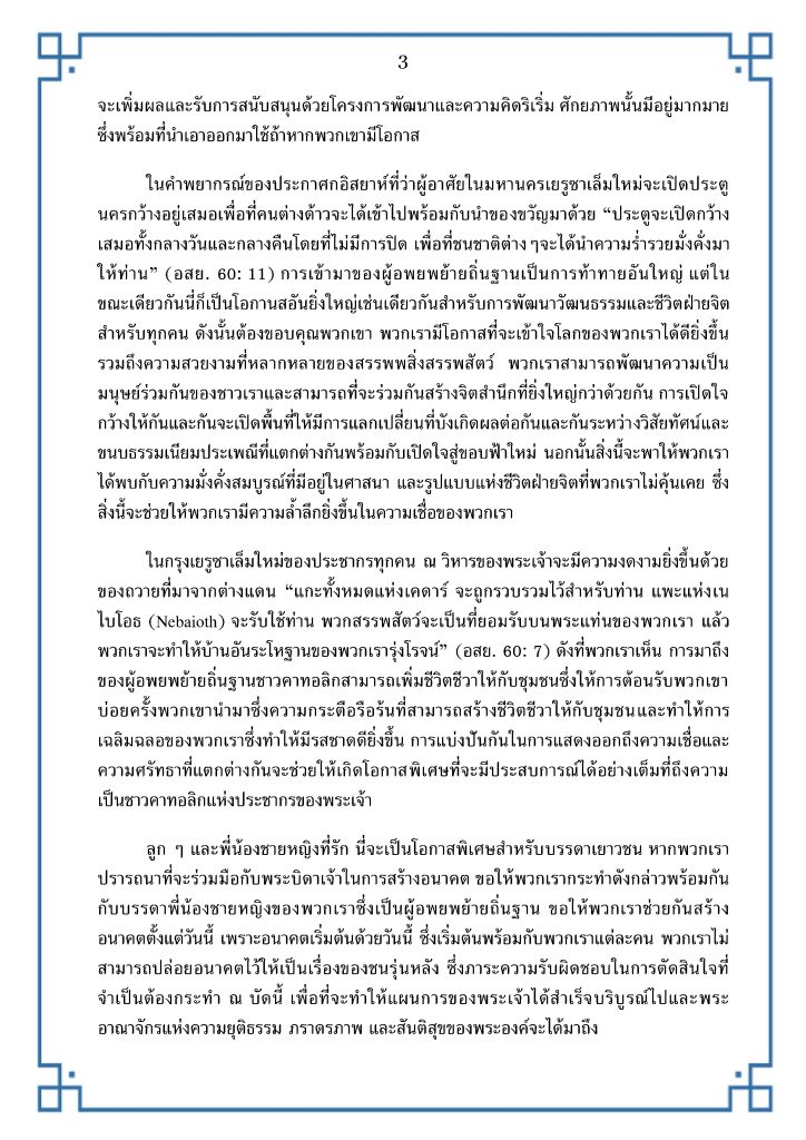 ในคำพยากรณ์ของประกาศกอิสยาห์ที่ว่าผู้อาศัยในมหานครเยรูซาเล็มใหม่จะเปิดประตูนครกว้างอยู่เสมอเพื่อที่คนต่างด้าวจะได้เข้าไปพร้อมกับนำของขวัญมาด้วย “ประตูจะเปิดกว้างเสมอทั้งกลางวันและกลางคืนโดยที่ไม่มีการปิด เพื่อที่ชนชาติต่างๆจะได้นำความร่ำรวยมั่งคั่งมาให้ท่าน” (อสย. 60: 11) การเข้ามาของผู้อพยพย้ายถิ่นฐานเป็นการท้าทายอันใหญ่ แต่ในขณะเดียวกันนี่ก็เป็นโอกานสอันยิ่งใหญ่เช่นเดียวกันสำหรับการพัฒนาวัฒนธรรมและชีวิตฝ่ายจิตสำหรับทุกคน ดังนั้นต้องขอบคุณพวกเขา พวกเรามีโอกาสที่จะเข้าใจโลกของพวกเราได้ดียิ่งขึ้นรวมถึงความสวยงามที่หลากหลายของสรรพพสิ่งสรรพสัตว์ พวกเราสามารถพัฒนาความเป็นมนุษย์ร่วมกันของชาวเราและสามารถที่จะร่วมกันสร้างจิตสำนึกที่ยิ่งใหญ่กว่าด้วยกัน การเปิดใจกว้างให้กันและกันจะเปิดพื้นที่ให้มีการแลกเปลี่ยนที่บังเกิดผลต่อกันและกันระหว่างวิสัยทัศน์และขนบธรรมเนียมประเพณีที่แตกต่างกันพร้อมกับเปิดใจสู่ขอบฟ้าใหม่ นอกนั้นสิ่งนี้จะพาให้พวกเราได้พบกับความมั่งคั่งสมบูรณ์ที่มีอยู่ในศาสนา และรูปแบบแห่งชีวิตฝ่ายจิตที่พวกเราไม่คุ้นเคย ซึ่งสิ่งนี้จะช่วยให้พวกเรามีความล้ำลึกยิ่งขึ้นในความเชื่อของพวกเรา